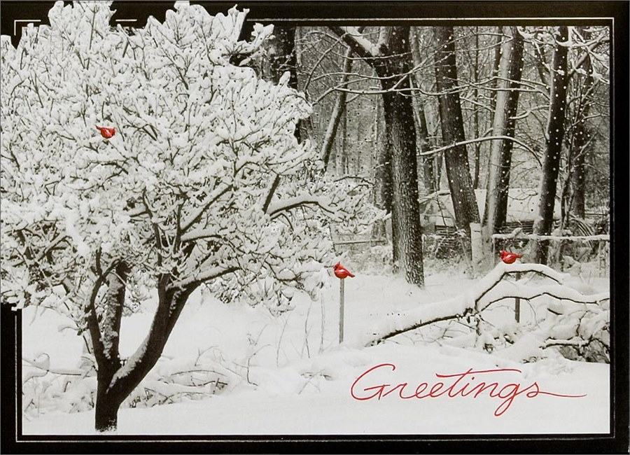 Red cardinals dot this black and white snow covered scene on which Greetings is printed in red script. Dotted with silver foil, the scene is framed in silver foil with a black border for a strikingly beautiful holiday greeting. Your custom imprinted verse and personalization is included.