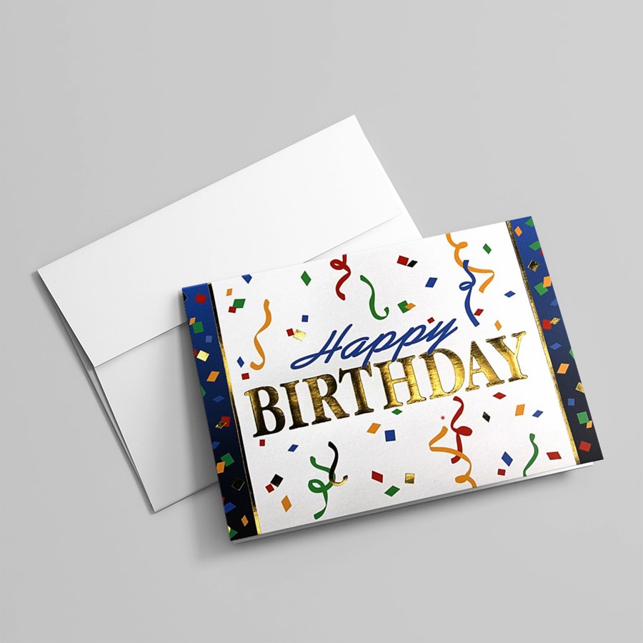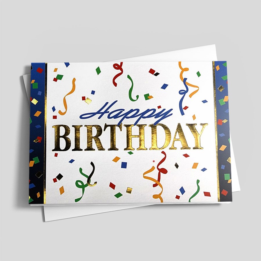 Colorful confetti falls from the sky to get the party started with this nice happy birthday card. On white card stock, the word Birthday is stamped in gold foil as are pieces of confetti throughout. Perfect for business use, your personalization and custom imprinted verse is included.