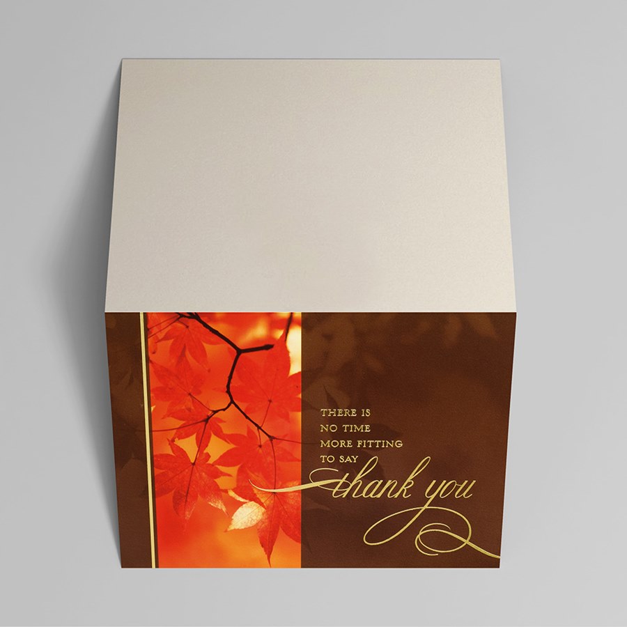 This beautiful thank you card in autumnal color tones is perfect for sharing with your most loyal customers at Thanksgiving. The warm sentiment of gratitude is stamped in gold foil and adds an elegant touch. Avoid the holiday mail clutter and send your holiday greeting early in the season! This product includes coordinating gold-lined envelopes.