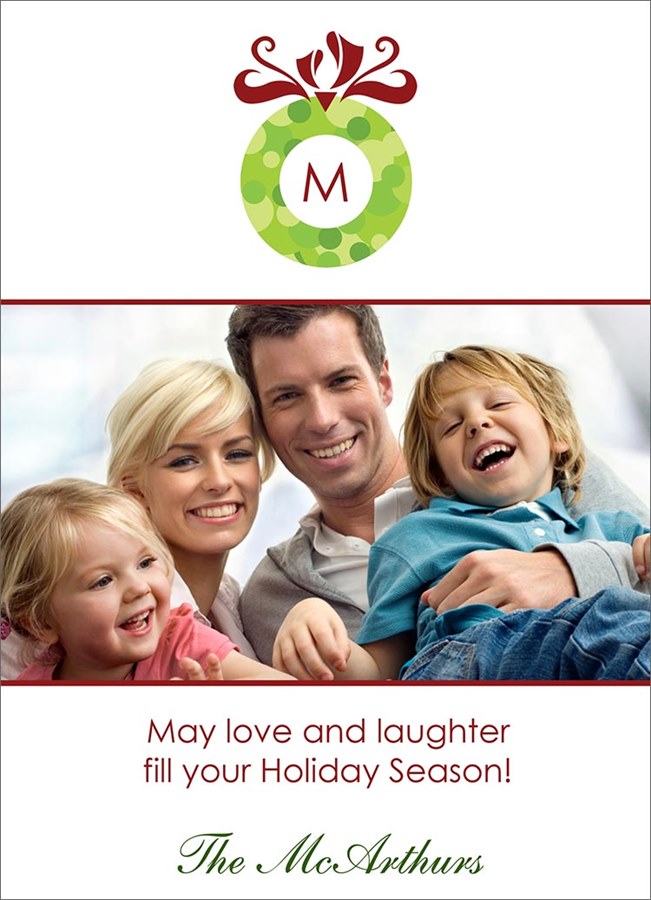 A modern wreath design surrounds your custom printed monogram on this attractive holiday photo card. Bordered by red, your favorite photograph is included. Below it on a background of white is your message and personalization printed in the ink colors and type styles of your choice. This card is the perfect way to share you holiday best wishes in truly personal style.