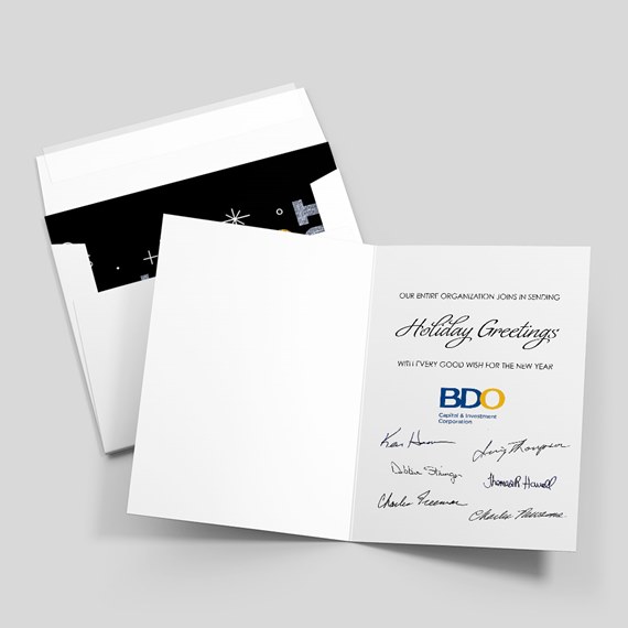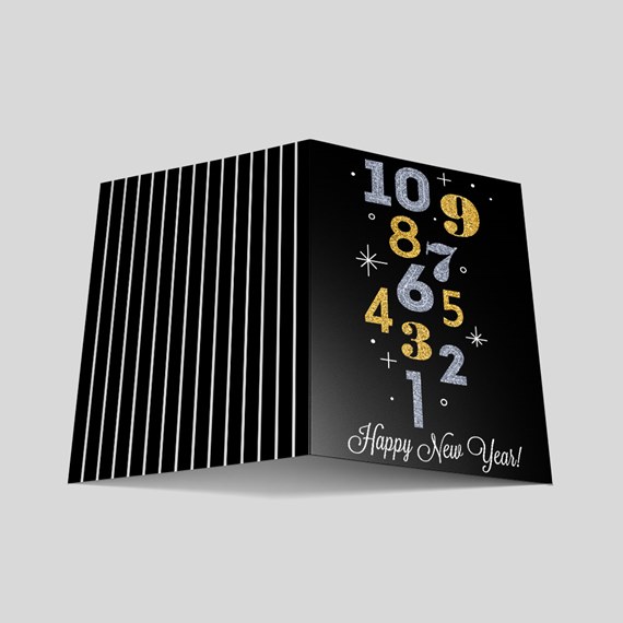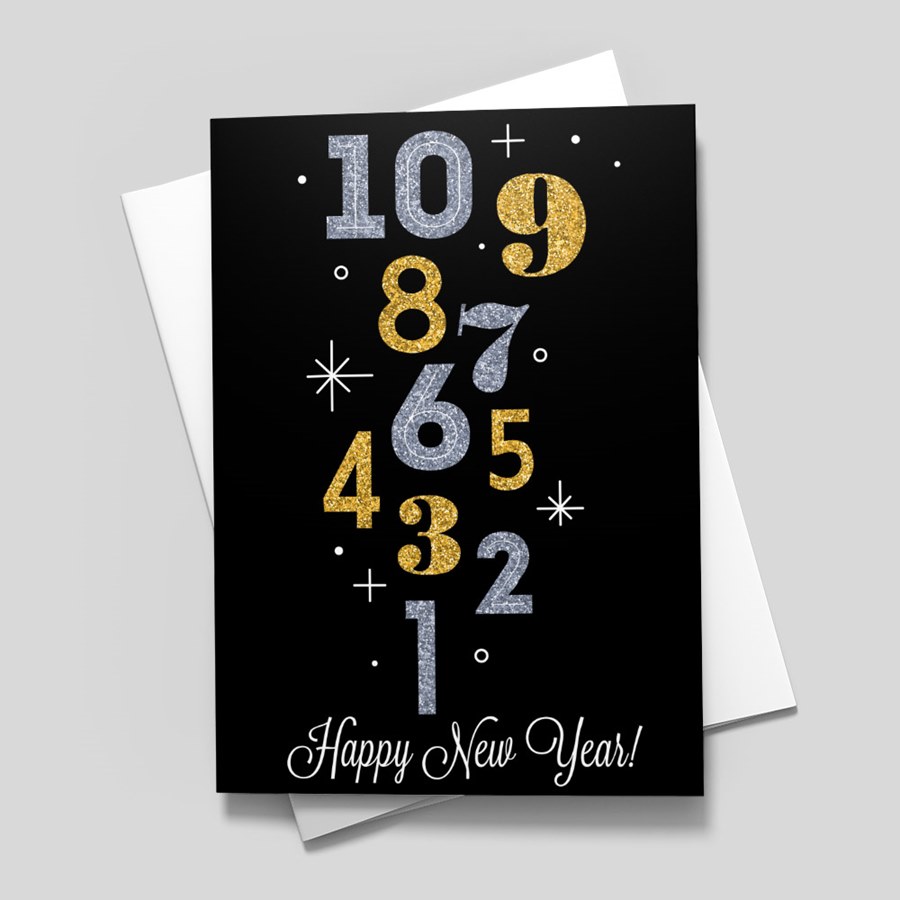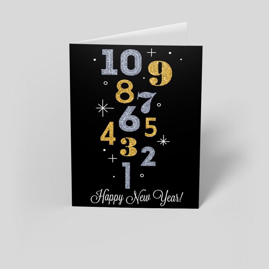 Start the countdown to the New Year off right with this cool, festive design. “Happy New Year!” in bright white lettering stands out sharply against glittery silver and gold numbers of the countdown. This unique card design works for any New Year celebration. *Please note that this card is not foiled or embossed.*