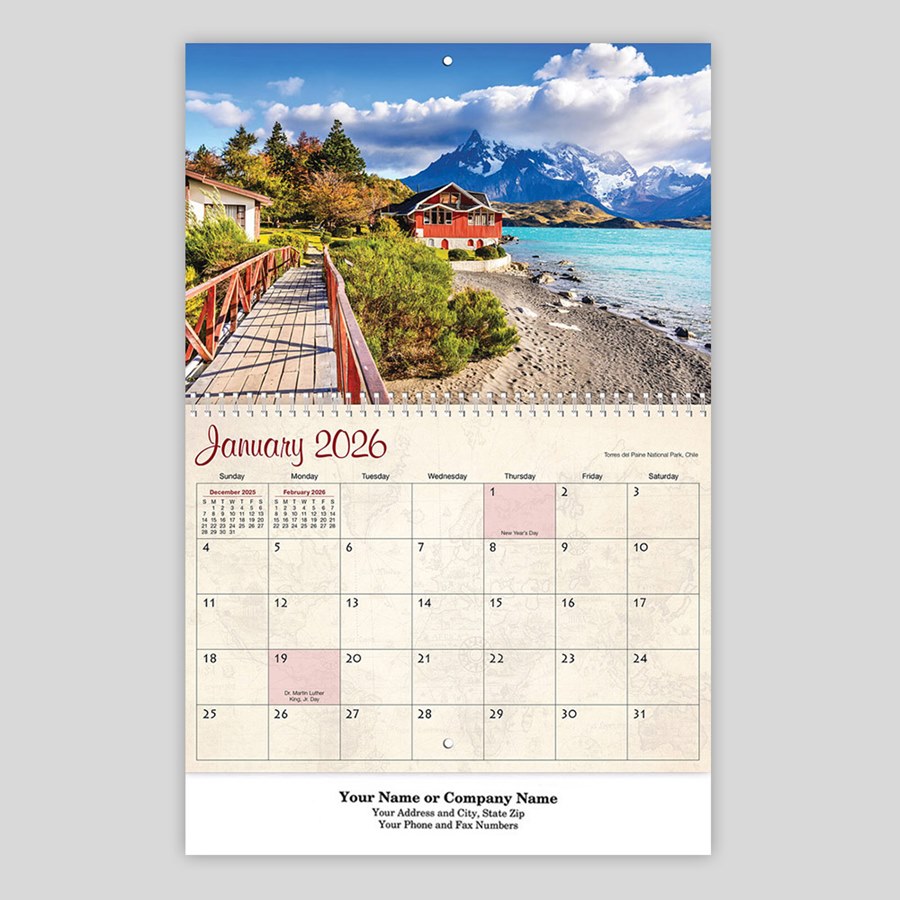 Help your customers stay organized! Take in the spectacular views every month of the year with this spiral-bound wall calendar. Promotional wall calendars with a spiral bound center feature large boxes for writing notes and appointments and a top punch for easy hanging.