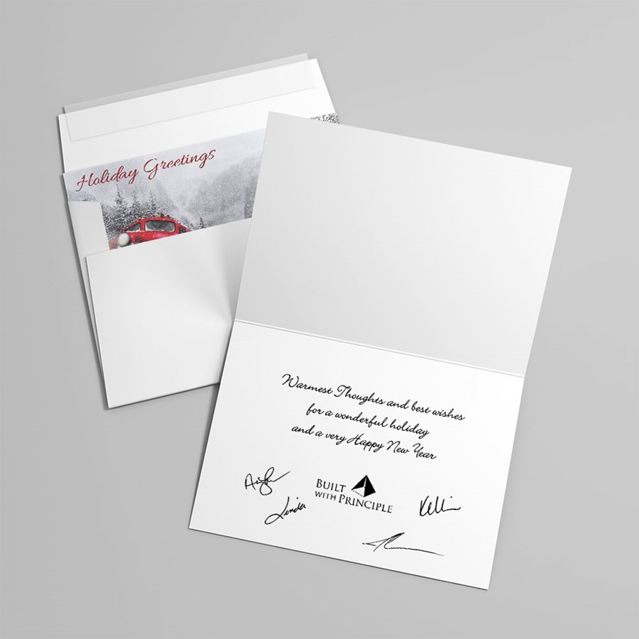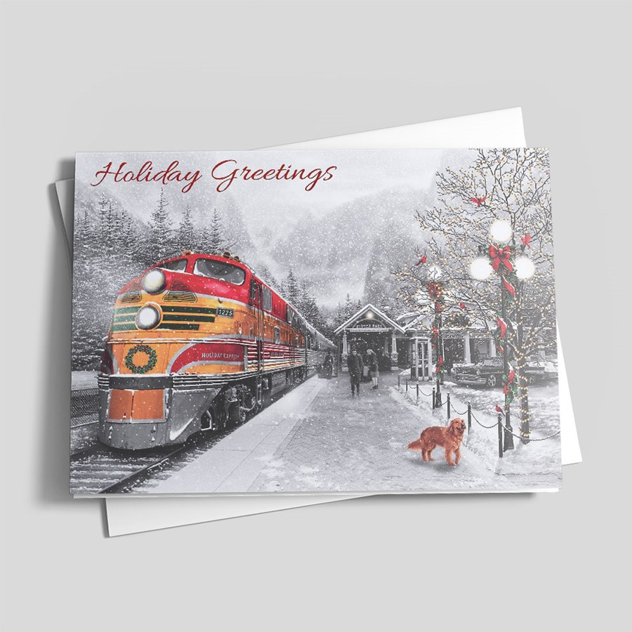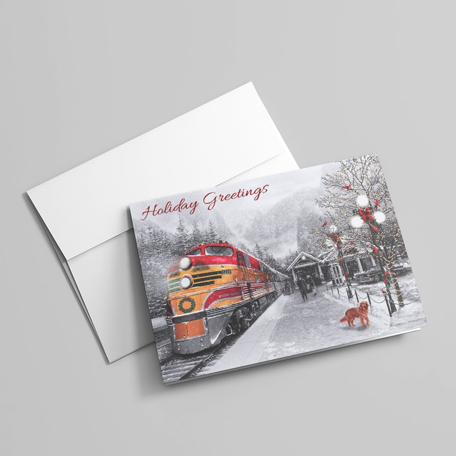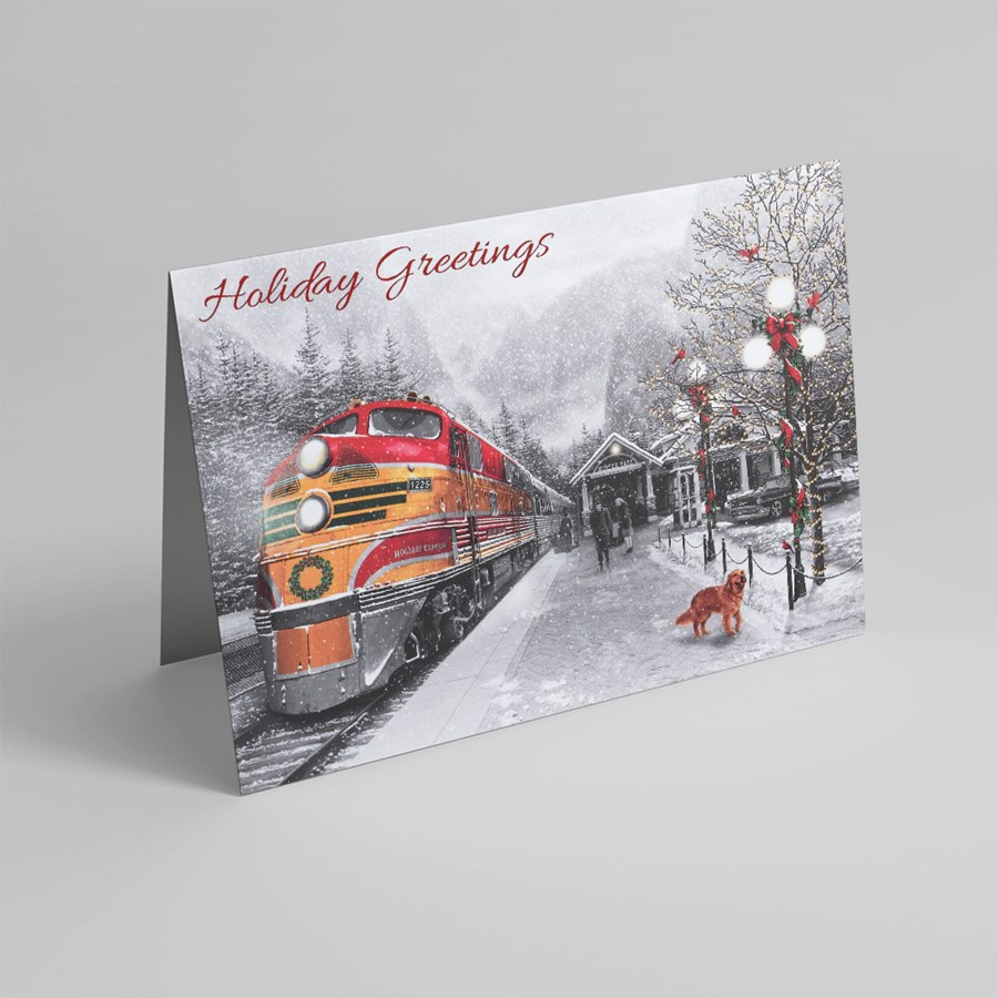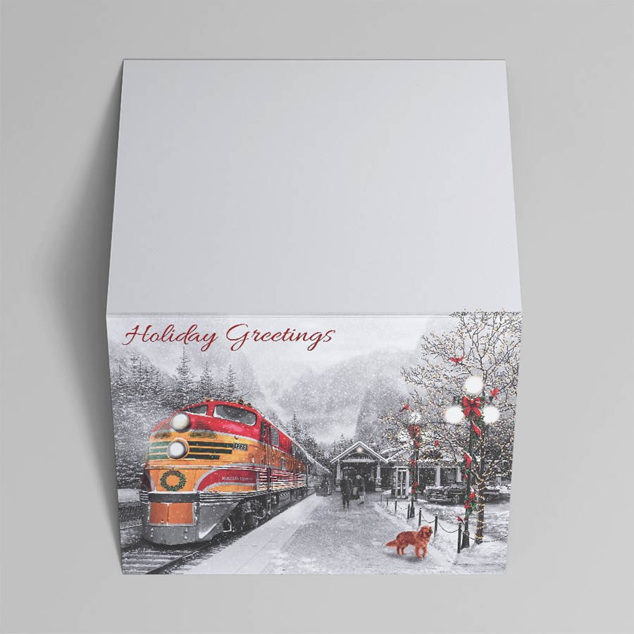 The holiday express train just made it way to the station in this black and white winter sketch highlighted with bright colors of the season. A scripted red foil "Holiday Greetings" adds to the look of the holiday card. Create your ideal verse on the inside along with digital signatures and a company logo.