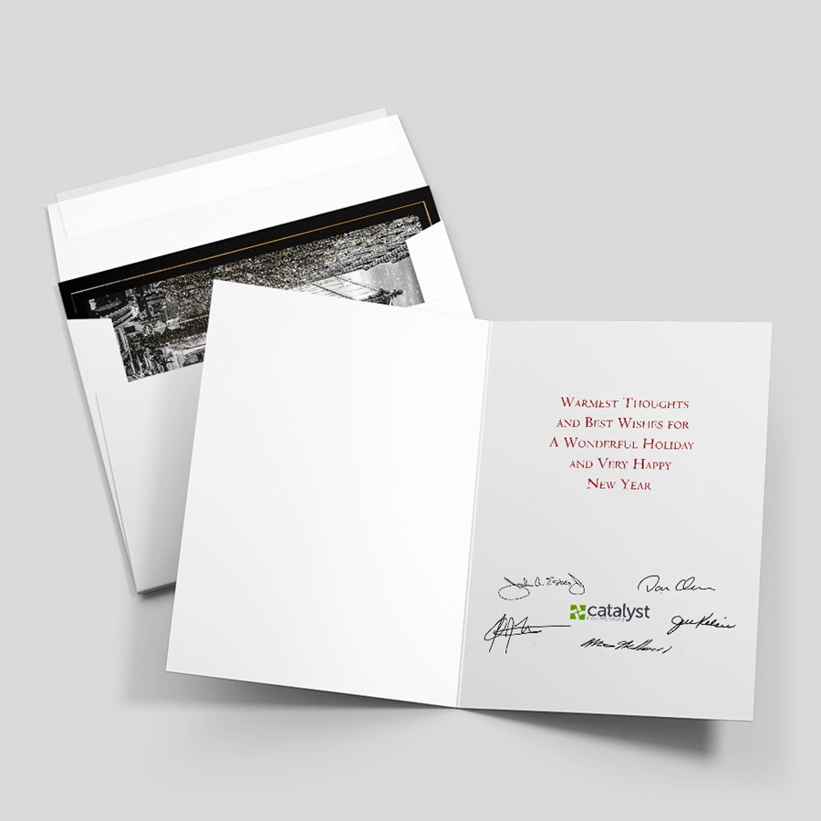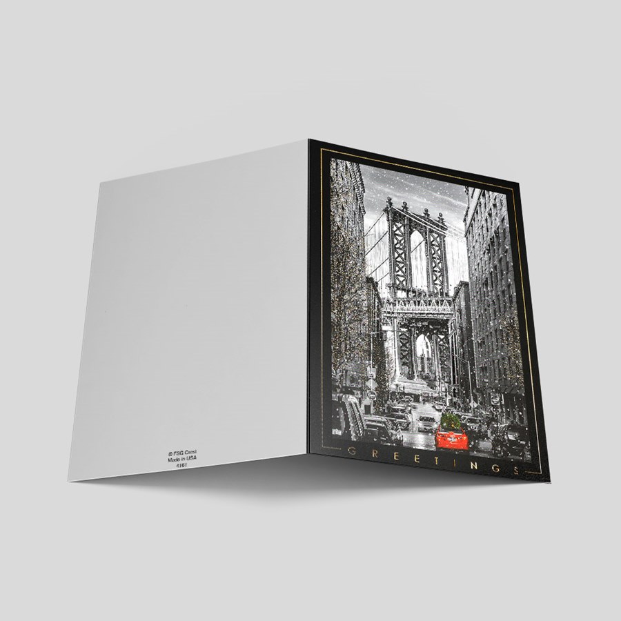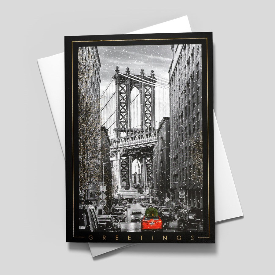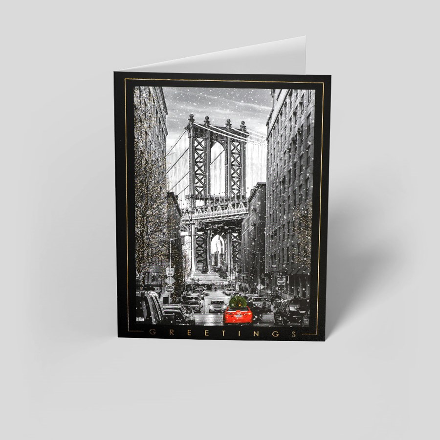 A black and white photo of the Brooklyn bridge is expertly decorated with gold foil falling snow and a single red car bringing home a Christmas tree. Matching foil borders the image and spells out "Greetings" on front. Create your ideal verse on the inside along with digital signatures and a company logo.