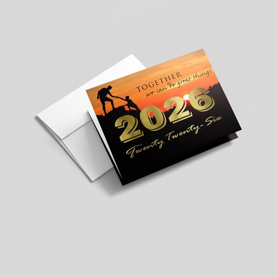 This tri-fold custom calendar card has a vertical format and measures 6 3/4" x 14 5/8". It features the silhouette of a male and female climbing a cliff at sunset with a message of 'Together we can do great things' in stylish black text. The year 2025 is displayed below in stylish gold foil letters and numbers on a black background above the days and months in gold. Add your free personalization, including a name or company name, message, photo, logo, signatures, and more! Choose from different paper types and envelopes with gummed or sanitary peel-and-seal closures. Want to have your personalized cards mailed to your recipients for you? Click 'Addressing + US Stamp + Mail' under the 'Addressing' tab when making your selections.