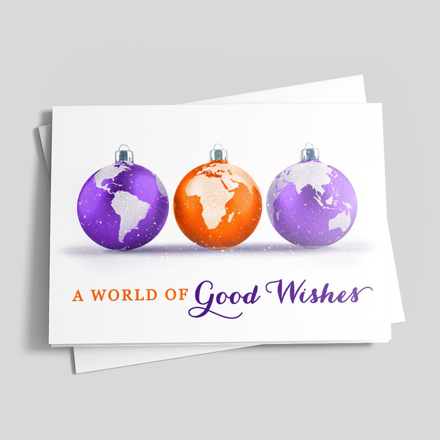 This custom holiday card features three ornaments with a globe design in purple, orange, and white. The ornaments are presented on a white background with a message underneath that reads, 'A WORLD OF Good Wishes' in stylish orange and purple text. The interior and back of the card are white. Choose from different sizes, paper types, and envelopes, then add your personalizations.