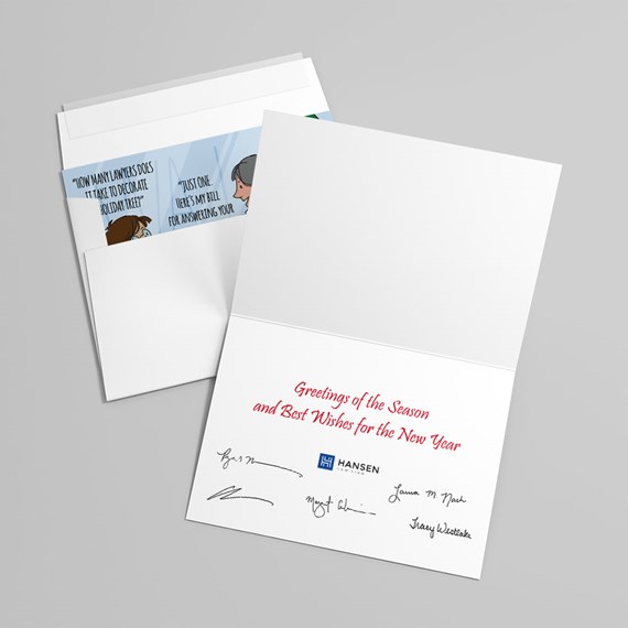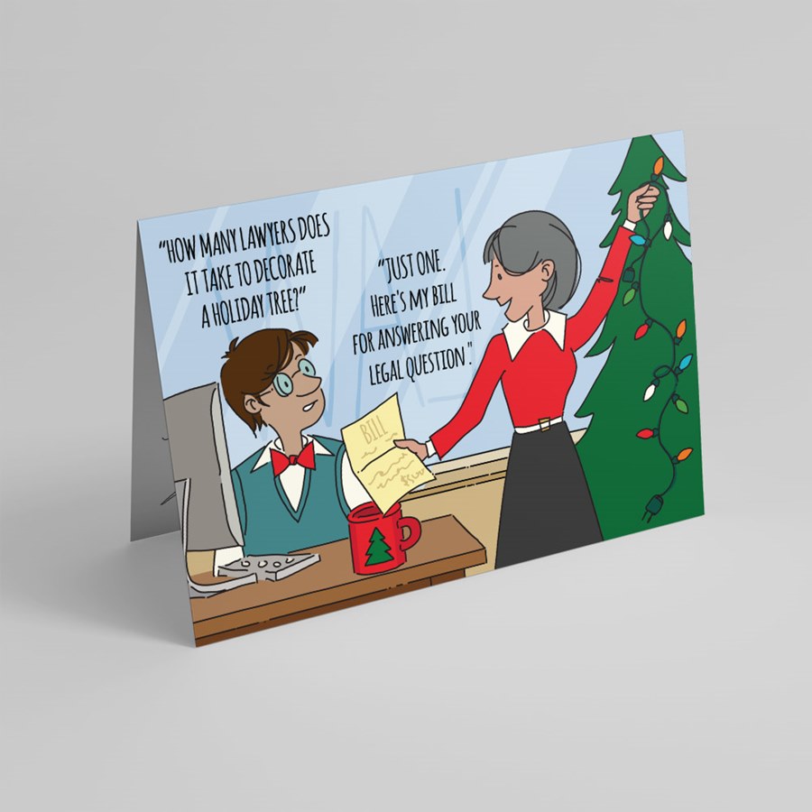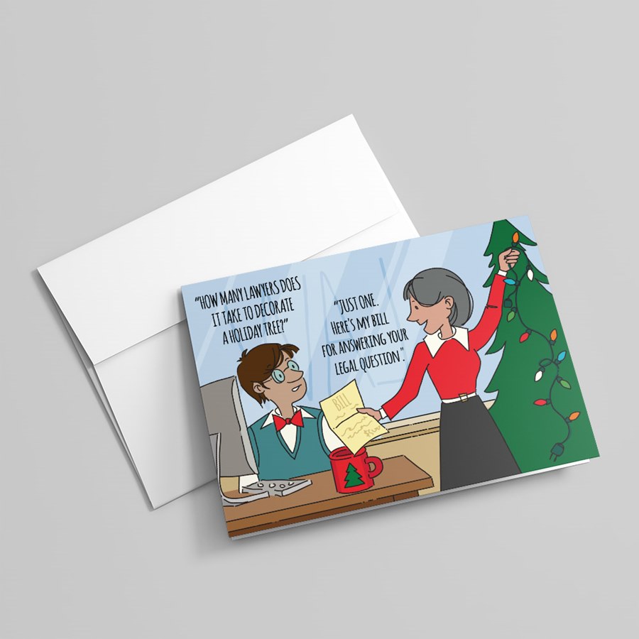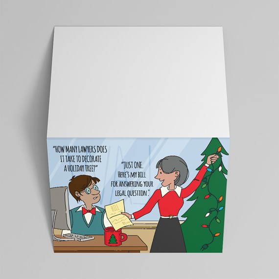 Give the gift of laughter this holiday season with our witty "Lawyer's Bill" Holiday Humor Card! This clever card features a relatable cartoon scene where a festive colleague is presented with a bill after asking a classic lawyer joke: "HOW MANY LAWYERS DOES IT TAKE TO DECORATE A HOLIDAY TREE?" The punchline? "JUST ONE. HERE'S MY BILL FOR ANSWERING YOUR LEGAL QUESTION."