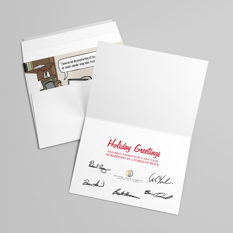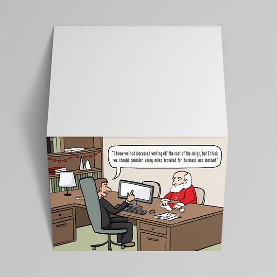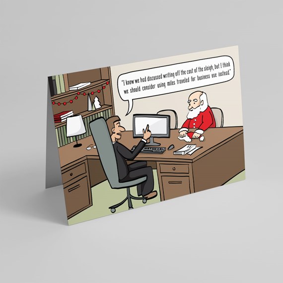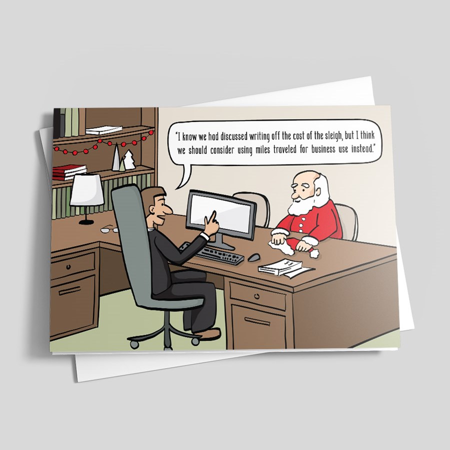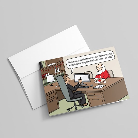 Bring a chuckle to clients, colleagues, and business associates this holiday season with our hilarious "Sleigh Miles" Business Humor Holiday Card! This unique card features a witty cartoon illustration of Santa Claus in a serious business meeting, discussing tax write-offs for his sleigh with an accountant. The dialogue, "I know we had discussed writing off the cost of the sleigh, but I think we should consider using miles traveled for business use instead," is sure to resonate with anyone in the corporate or financial world. Perfect for accounting firms, financial services, tax professionals, or any business looking to share a lighthearted and relatable holiday message. This card stands out from traditional designs, offering a memorable way to spread cheer and show appreciation while highlighting your industry's unique humor. Add your free customization, including a name or company name, message, photo, logo, signatures, and more! Choose from different sizes, paper types, and envelopes with gummed or sanitary peel-and-seal closures. Want to have your personalized cards mailed to your recipients for you? Click 'Addressing + US Stamp + Mail' under the 'Addressing' tab when making your selections.