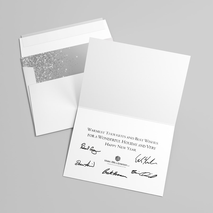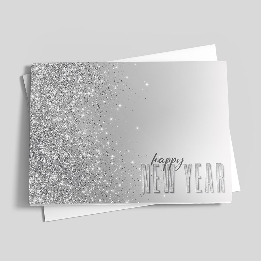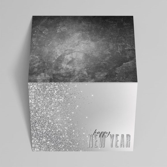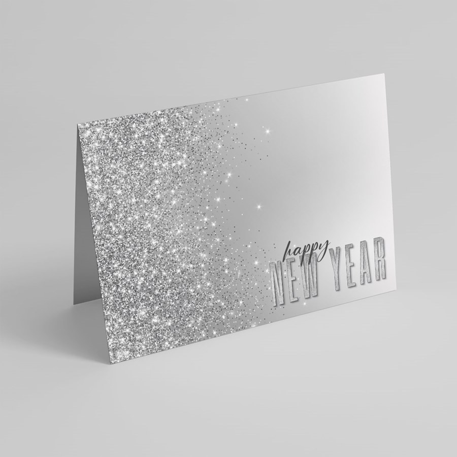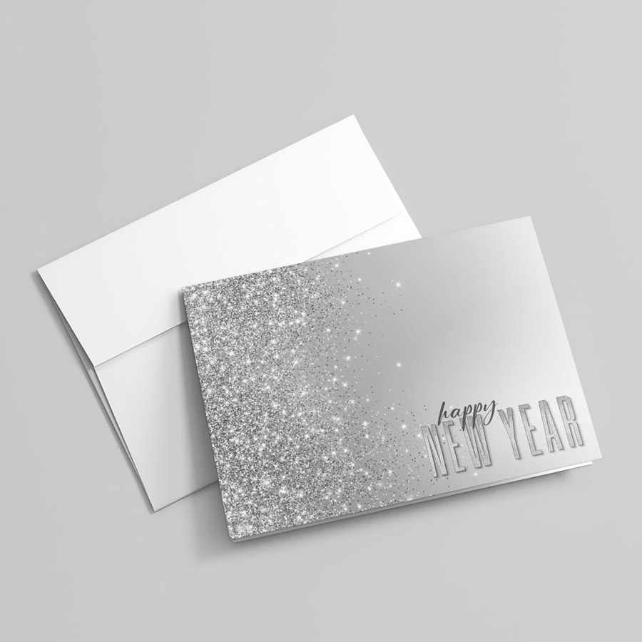 Welcome the new year with sophistication and style using the Stunning Silver New Year Card. This elegant greeting features a modern design with silver accents set against a deep, dramatic background, perfect for capturing attention and conveying your heartfelt wishes. Ideal for corporate or personal use, this card helps you send a message of hope, renewal, and success in the year ahead. Add your free customization, like a name or company name, message, photo, logo, signatures, and more. Choose from multiple sizes, paper stocks, and envelope options, including traditional gummed or sanitary peel-and-seal closures. You can even have your personalized cards mailed for you—simply select 'Addressing + US Stamp + Mail' at checkout.