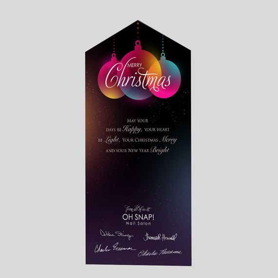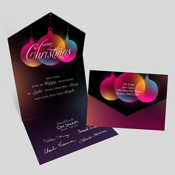 Celebrate the season with a card that feels both modern and meaningful. The Colorful Illusions Seal and Send Christmas Card features a bold, geometric tree design in jewel-toned shades of green, red, blue, and gold, all layered over a soft watercolor background. Clean lines and subtle color gradients give this design a contemporary edge, while the message inside offers a warm, heartfelt wish for peace and joy. This all-in-one card includes space for your personalized message and recipient address, folds neatly, and seals closed—no envelope needed. Choose from different paper types with a size of 5 5/8" x 3 3/4". Add a name, company name, personalized message, logo, photo, signatures, and more! *Includes free clear round seals for securing.*