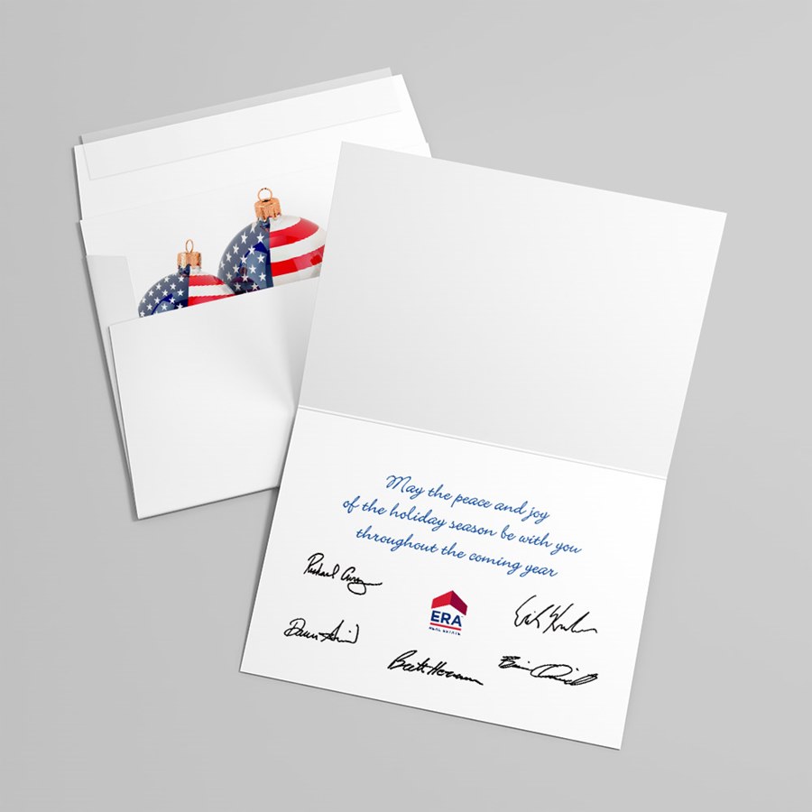 Celebrate the spirit of the season with this patriotic American Flag Ornaments Christmas Card. Featuring beautifully illustrated ornaments shaped like the American flag, this design brings a heartfelt tribute to your holiday greetings. Crafted with premium quality cardstock and vibrant colors, it’s perfect for sending warm wishes to veterans, military families, or anyone who cherishes American pride during the holidays. The inside is blank, giving you plenty of space to add your personal message and share holiday cheer with friends and family. Make your Christmas greetings stand out with a meaningful design that reflects unity and festive joy.