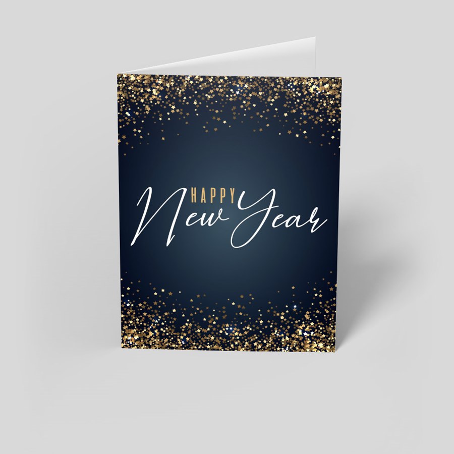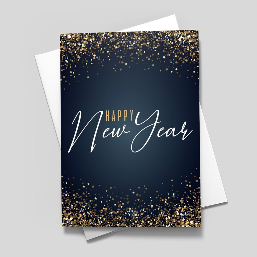 Ring in the new year with elegance and sparkle using this beautifully designed New Year greeting card. The card features a sleek navy blue background adorned with shimmering gold stars that create a festive frame, surrounding the stylish "Happy New Year" message in graceful script. Crafted with high-quality cardstock, this card is perfect for sending warm wishes to family, friends, or colleagues as you welcome the year ahead. The inside is perfect for your personalized message, allowing you to share your hopes and good cheer in your own words. Make your holiday greetings memorable with this sophisticated and festive design.
