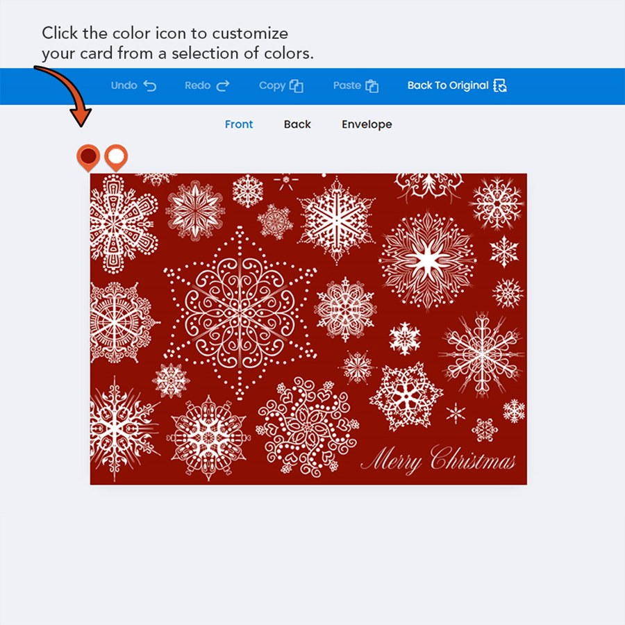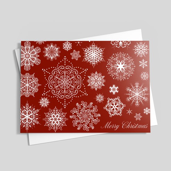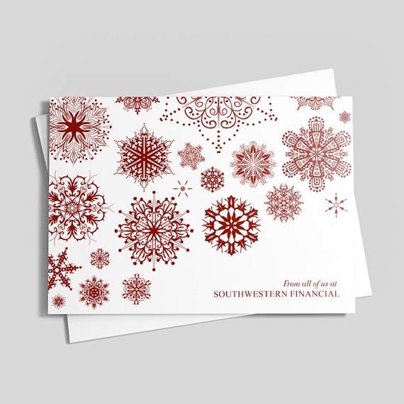 Celebrate the season with elegance using the Snowflake Cluster Holiday Card. This sophisticated design features a delicate arrangement of white snowflakes against a rich red background, creating a wintery, refined aesthetic. Ideal for sending warm wishes to clients, colleagues, friends, and family, this card combines professional appeal with a festive tone. Add your free customization, like a name or company name, message, photo, logo, signatures, and more. Choose from different sizes, paper types, and envelopes with gummed or sanitary peel-and-seal closures. Want to have your personalized cards mailed to your recipients for you? Click 'Addressing + US Stamp + Mail' under the 'Addressing' tab when making your selections.