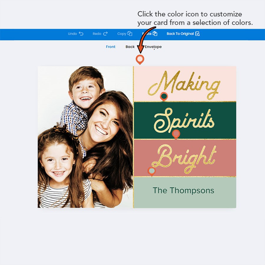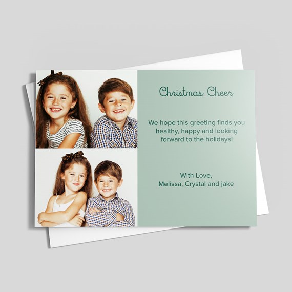 This photo Christmas card is wrapped up in whimsical style. The phrase “Making Spirits Bright” is printed in gold ink next to your photo. You can update the color palette from pink and green, to anything you choose! Personalize this photo card, and create a custom look with endless layout, photo, design and text options.