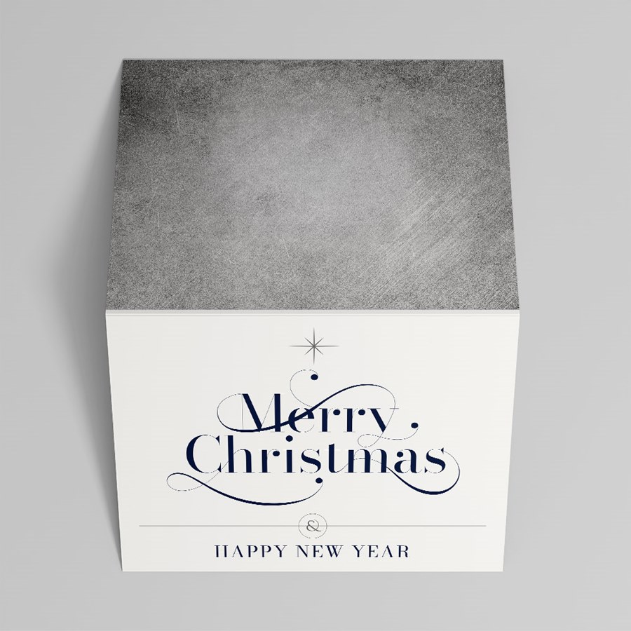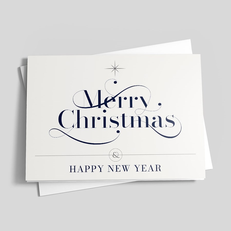 - Elegant typographic front: A folded white holiday greeting card printed with navy calligraphic 'Merry Christmas' in decorative script and a smaller serif 'HAPPY NEW YEAR' beneath for a refined seasonal message.