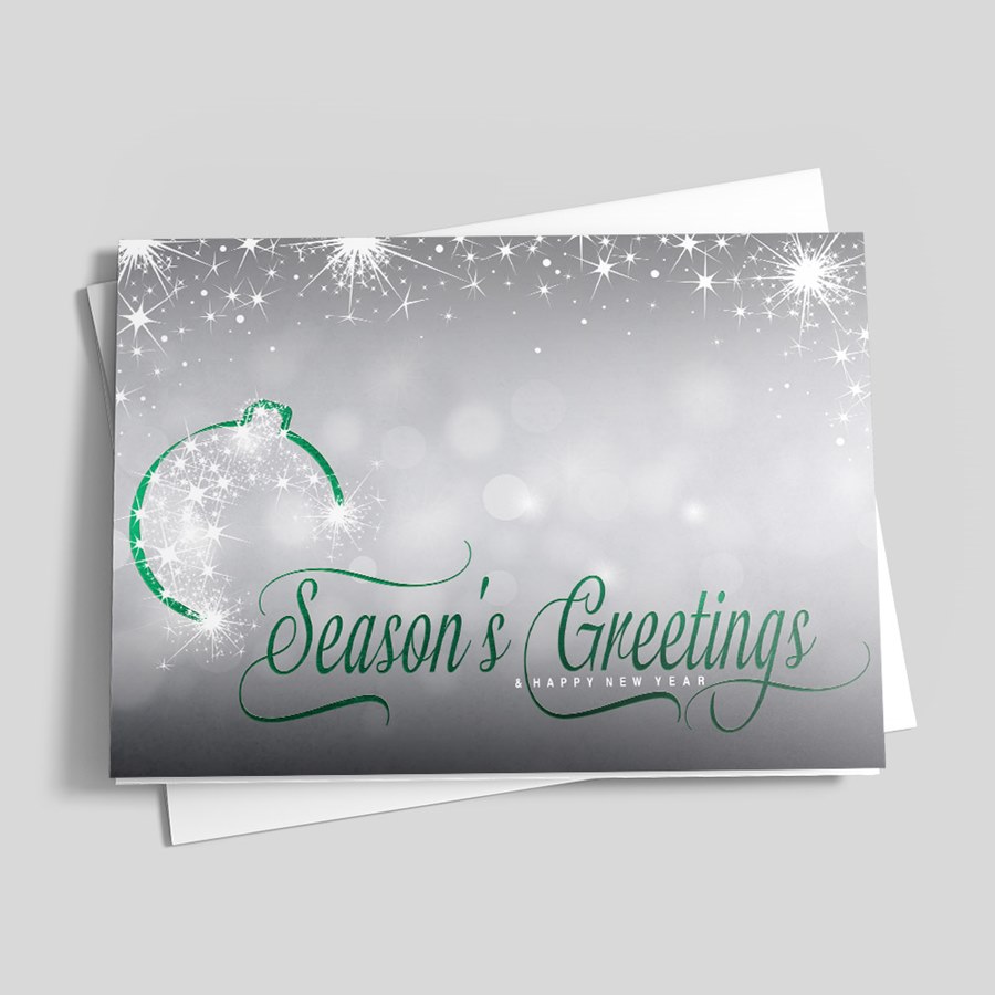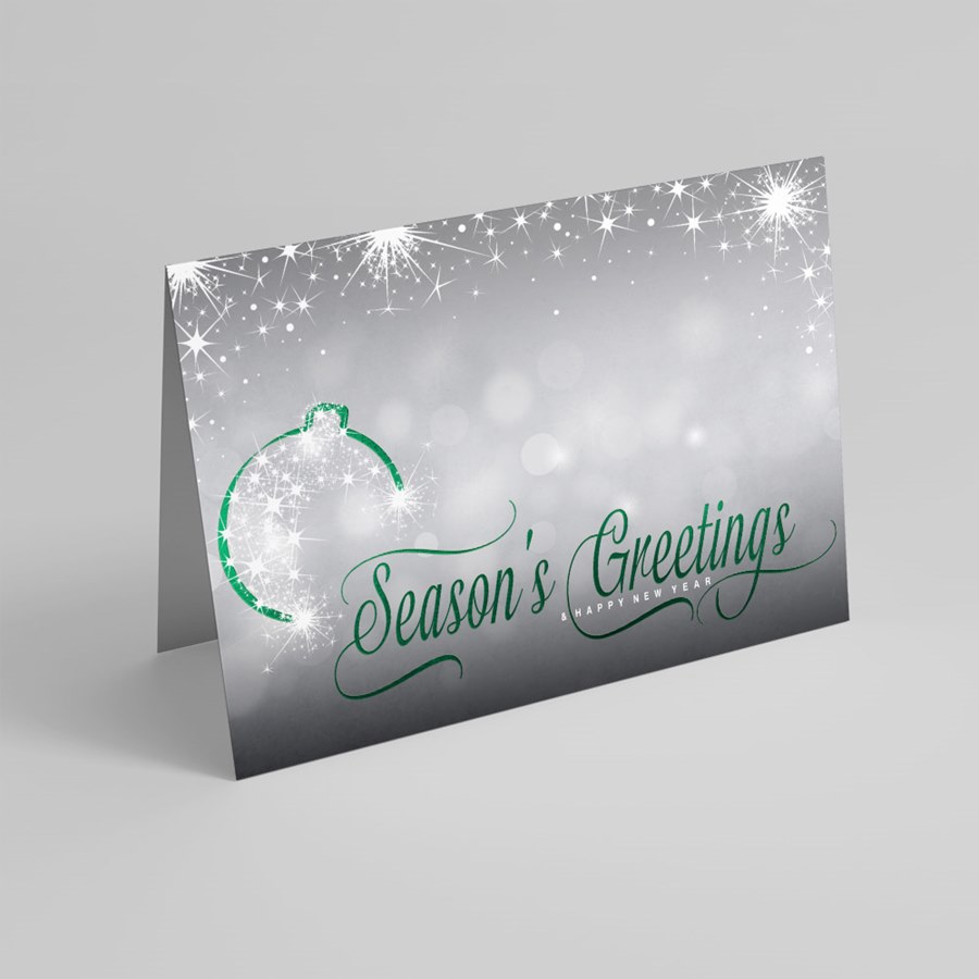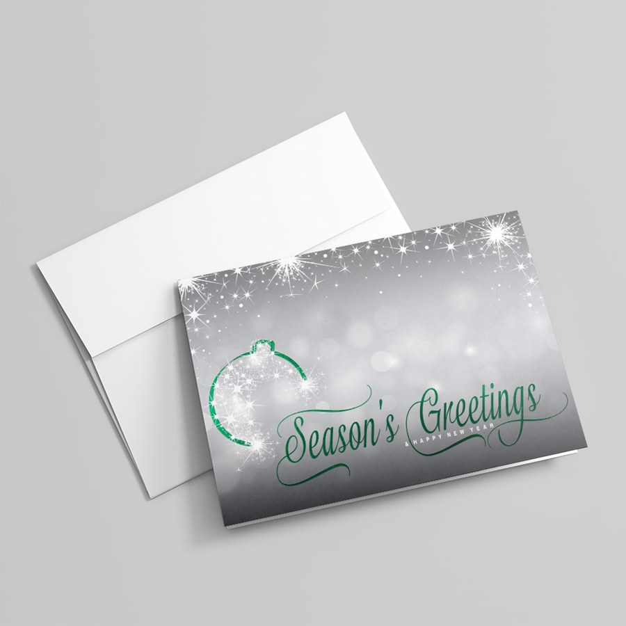 Folded holiday greeting card; includes matching white envelope. Cover art: silver-gray bokeh background with green script, star sparkles and ornament outline. Interior: white printed message or deep green option as shown.