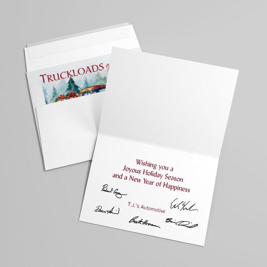 Ideal for client thank-yous, employee recognition, milestone celebrations and small-batch corporate mailings, this card works well when you want to add a personal touch to business relationships. Pair it with a handwritten note or your company stationery to reinforce connection and goodwill. Backed by our decades of experience in professional greetings, the Truckloads of Joy Card offers a tasteful way to send memorable, sincere messages.