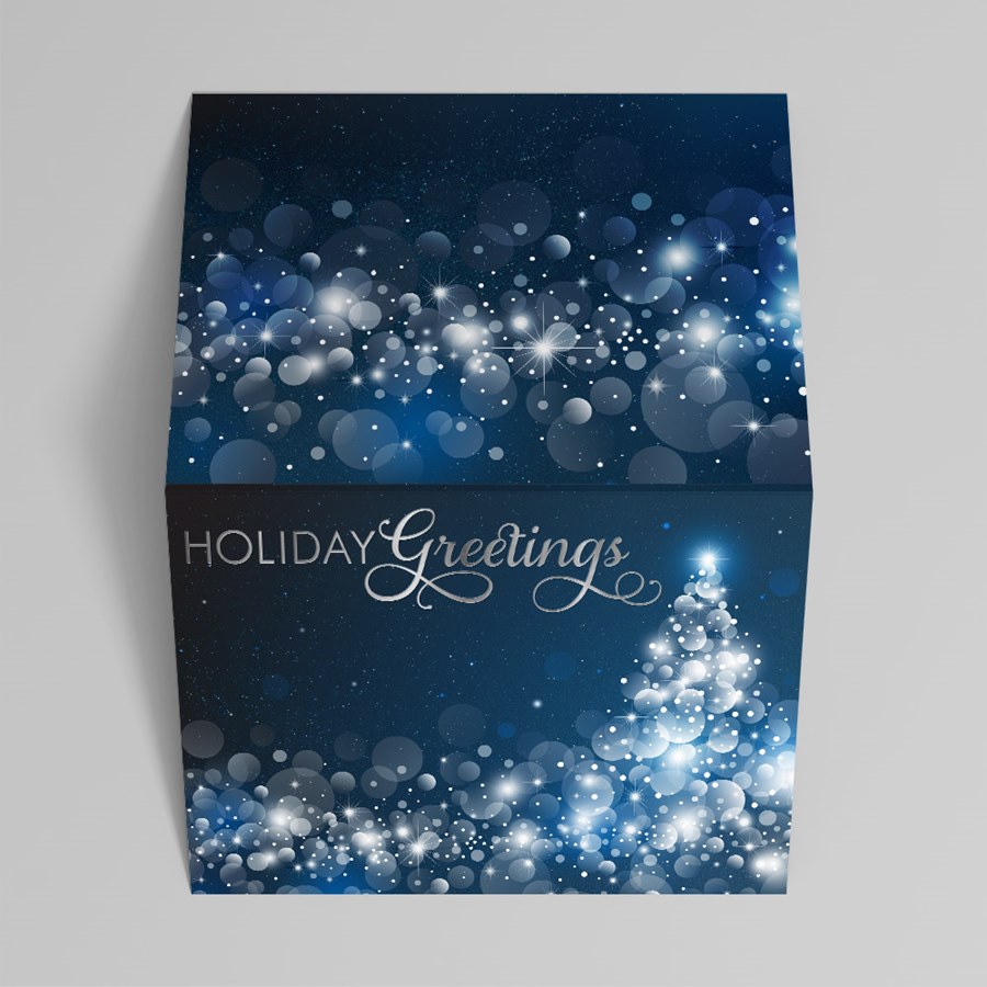 A refined, corporate-ready holiday card that pairs silver foil script with a deep navy field and white bokeh lights forming a stylized Christmas tree—festive yet restrained for broad business audiences.- Refined first impression: Silver foil 'Holiday Greetings' script on a navy background creates an upscale, professional tone ideal for client and executive correspondence.