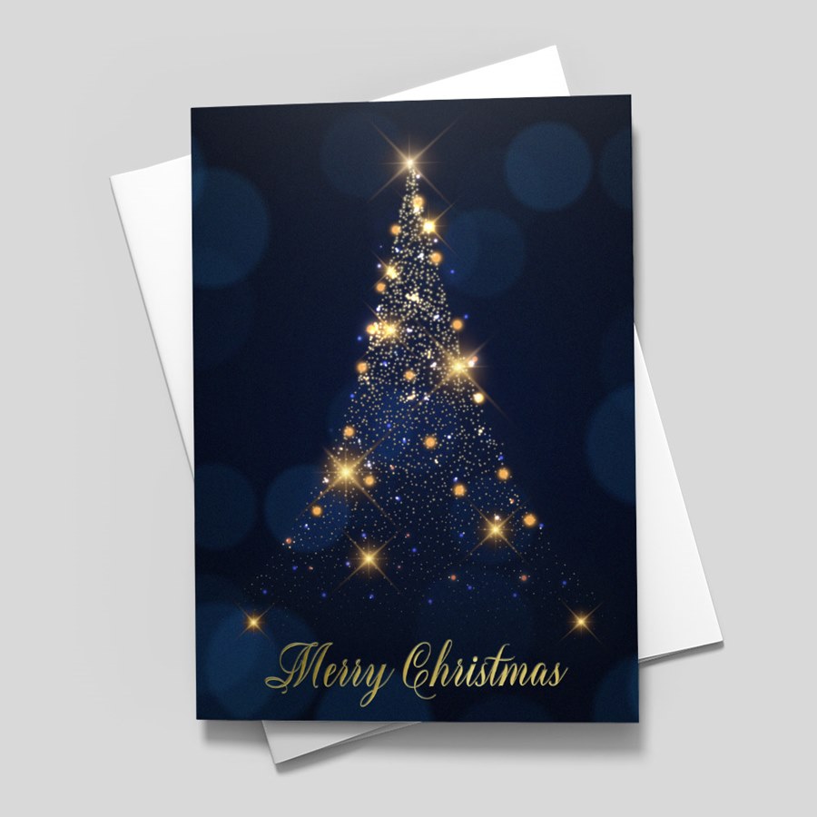 Elegant, modern holiday stationery that pairs a deep-navy backdrop with a stylized tree of gold and blue twinkling lights. Designed for a festive yet refined look, the card balances eye-catching detail with a mostly blank interior ready for your personal message.