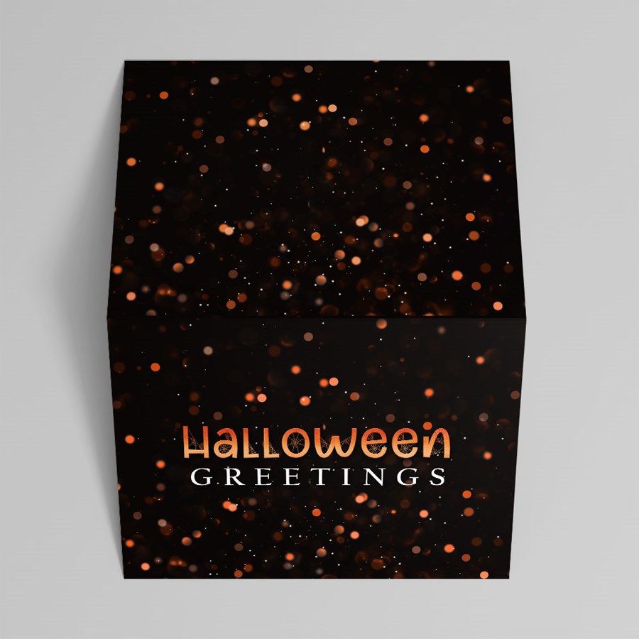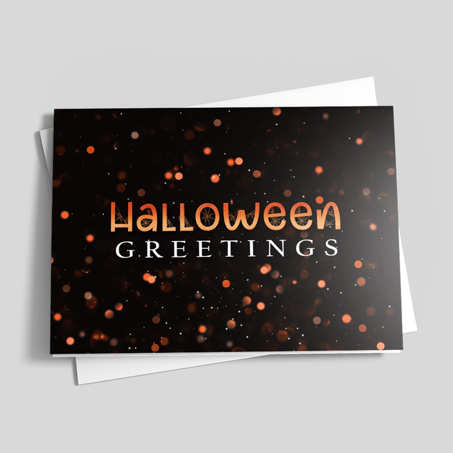 Make spooky-season mail memorable with a striking card that pairs playful typography and a dramatic black background with warm orange-and-white bokeh highlights. The front features a fun "Halloween" wordmark above a strong, white "GREETINGS" display for instant impact.
