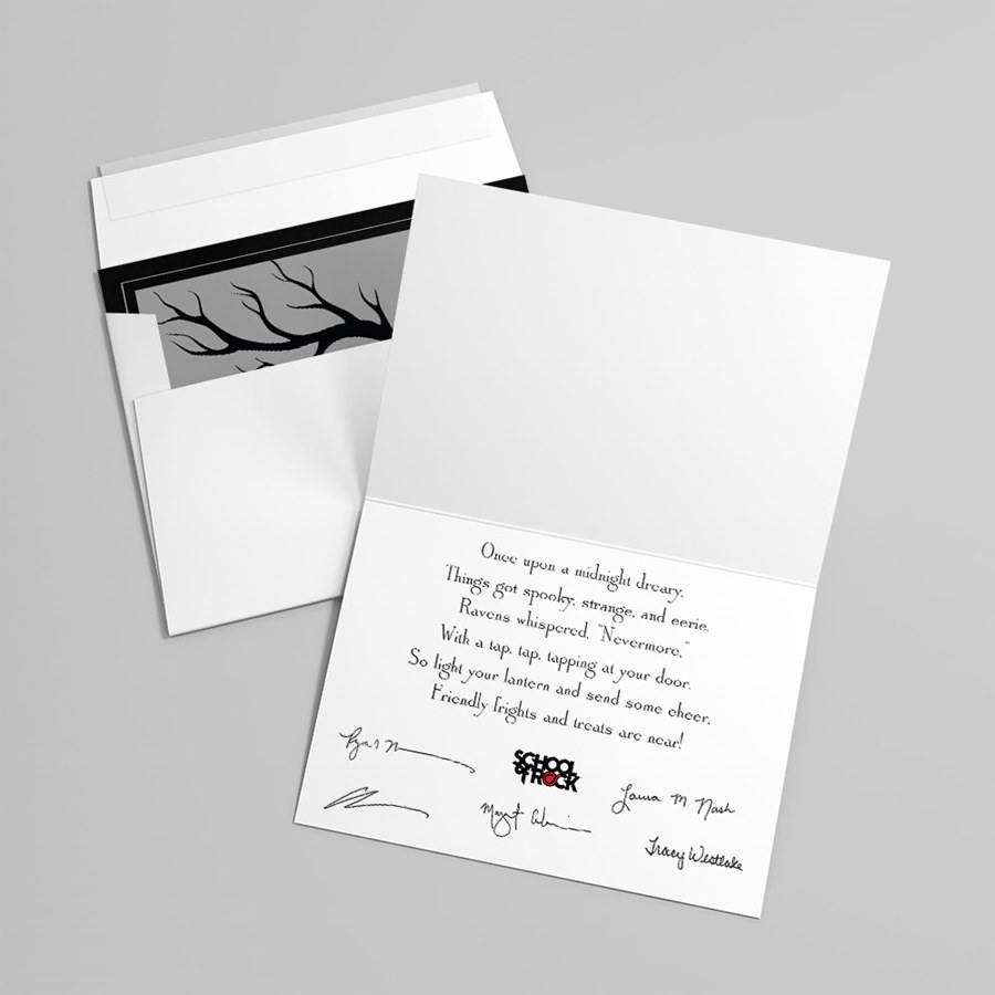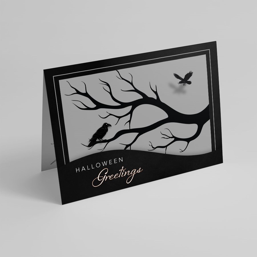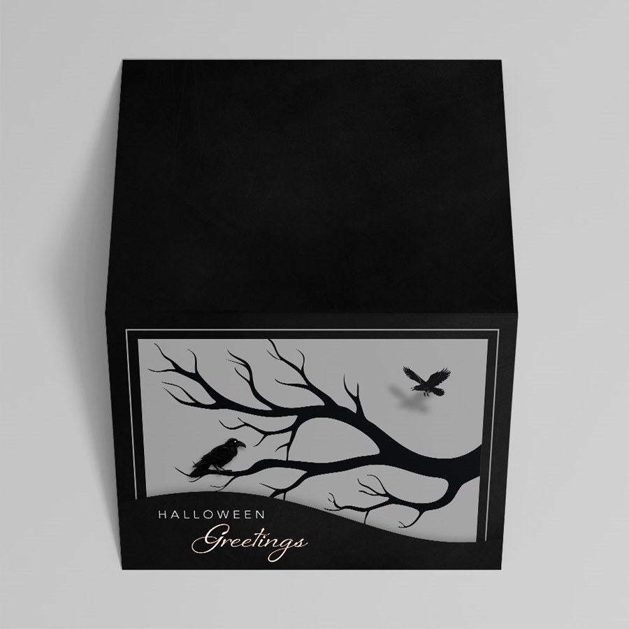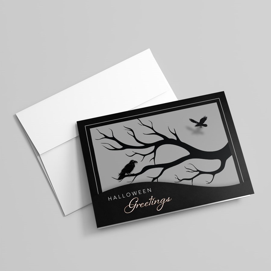 Make a memorable, seasonally stylish statement with the Midnight Enchantments Halloween Card. The design pairs a stark black-and-gray silhouette of bare branches and ravens with a decorative 'HALLOWEEN' heading and an elegant cursive 'Greetings' across the bottom; some images show white lettering with gold accents and a subtle gradient backdrop. The interior, as shown, contains a printed whimsical poem and a logo placeholder, and the card is pictured partially opened alongside a blank envelope—perfect for sending as-is or personalizing. Backed by our full-service print experience, this design balances spooky charm with polished presentation. Ideal for small businesses sending client season's greetings, event hosts creating themed invitations, or anyone wanting a refined Halloween note. Use the interior logo area to add subtle branding, include a short custom message, or mail these as enclosed event inserts. If you’d like help with custom text or logo placement, our team—trusted since 1998—provides hands-on support to get your cards ready for print and delivery.Common Customer Questions