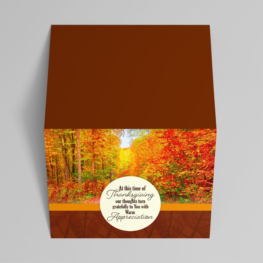 This folded greeting card features a scenic autumn landscape in vivid oranges, yellows and greens, centered on a circular cream text area set in a decorative, elegant font. A textured brown band anchors the design at the bottom with a thin orange stripe for warm contrast, while the white exterior and interior reveal a matching forest scene. An interior mockup shows a gold-printed Thanksgiving message with a sample logo and signatures, conveying a polished, seasonal sentiment. Trusted since 1998. Thoughtfully designed for giving thanks, this card brings seasonal warmth to personal and professional notes alike. Use it for Thanksgiving place cards, heartfelt messages to family and friends, client and employee appreciation, or any fall correspondence where a welcoming, autumnal look matters.Common Customer Questions