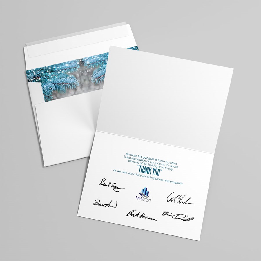 - Coordinated presentation: Rounded corners and a matching envelope whose interior shows a blue evergreen-branch pattern with snow provide a refined, brand-ready finish.
