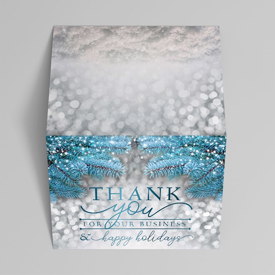 - Seasonal professionalism: A frosty silver bokeh background and blue pine branches at the top frame a clear, elegant message: 'THANK YOU' in dark teal, 'FOR YOUR BUSINESS' in smaller type, and '& happy holidays' in cursive—so your gratitude reads polished and sincere.