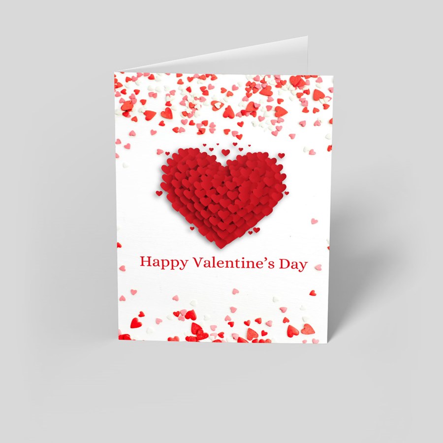 - Eye-catching motif: A large red heart composed of many smaller hearts centers on a crisp white background, surrounded by scattered red, pink and white hearts; "Happy Valentine’s Day" is printed in red beneath the design.