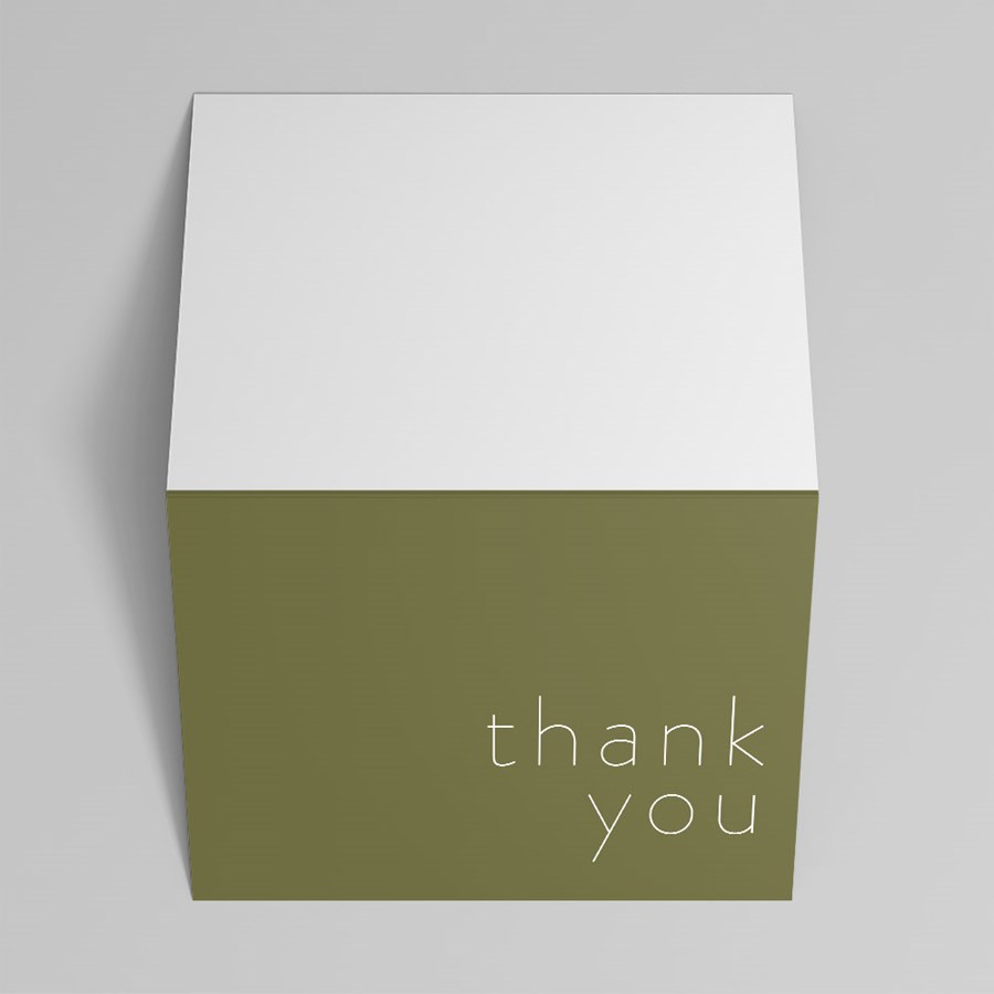 - Minimal front: Solid olive green front with the words "thank you" in a modern white sans-serif, positioned toward the bottom-right for a clean, contemporary look.