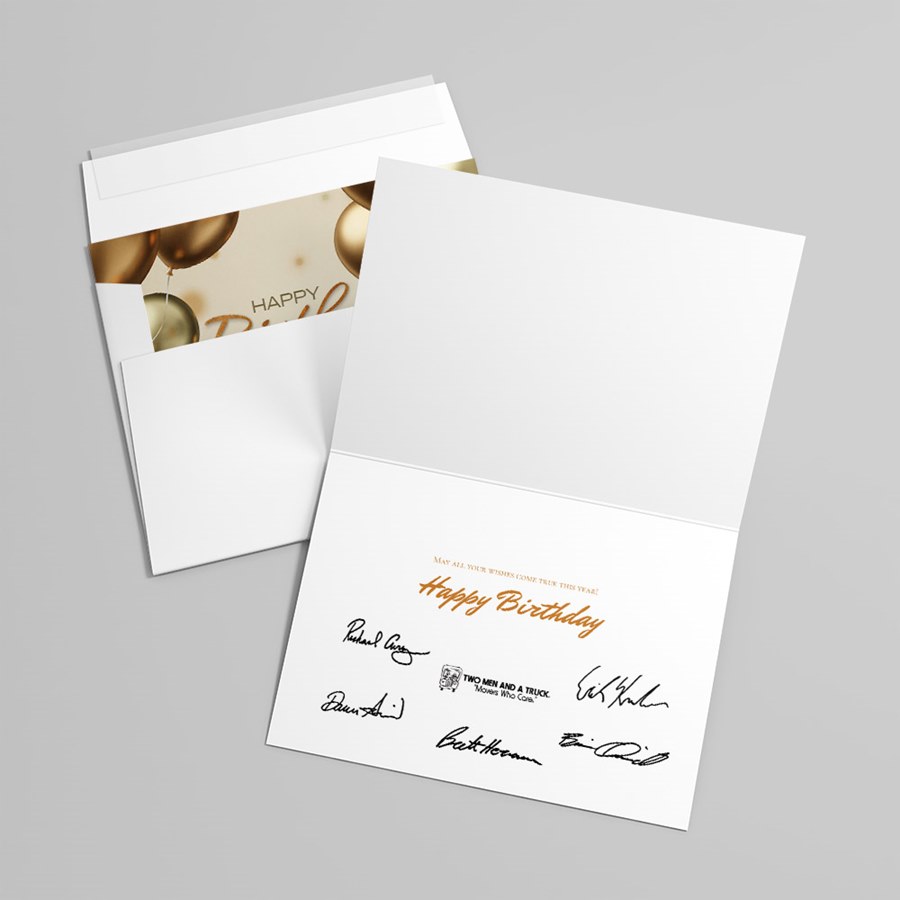 Celebrate together with a premium folded greeting card designed to make every birthday feel special. The front features the message “Happy Birthday” in an elegant font, with “From All of Us” displayed beneath, framed by clusters of golden metallic balloons set against a soft beige background. Rounded shapes and subtle gold accents create a festive yet refined look, while rounded corners and a smooth matte finish ensure the card feels as polished as it appears. Inside, a customizable text area and printed signature layout make it easy to include coordinated messages from teams, departments, or friend groups—no last-minute handwriting required.