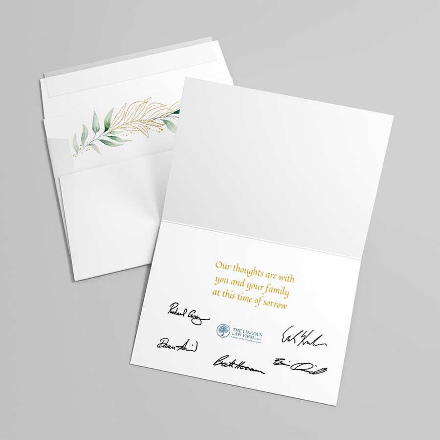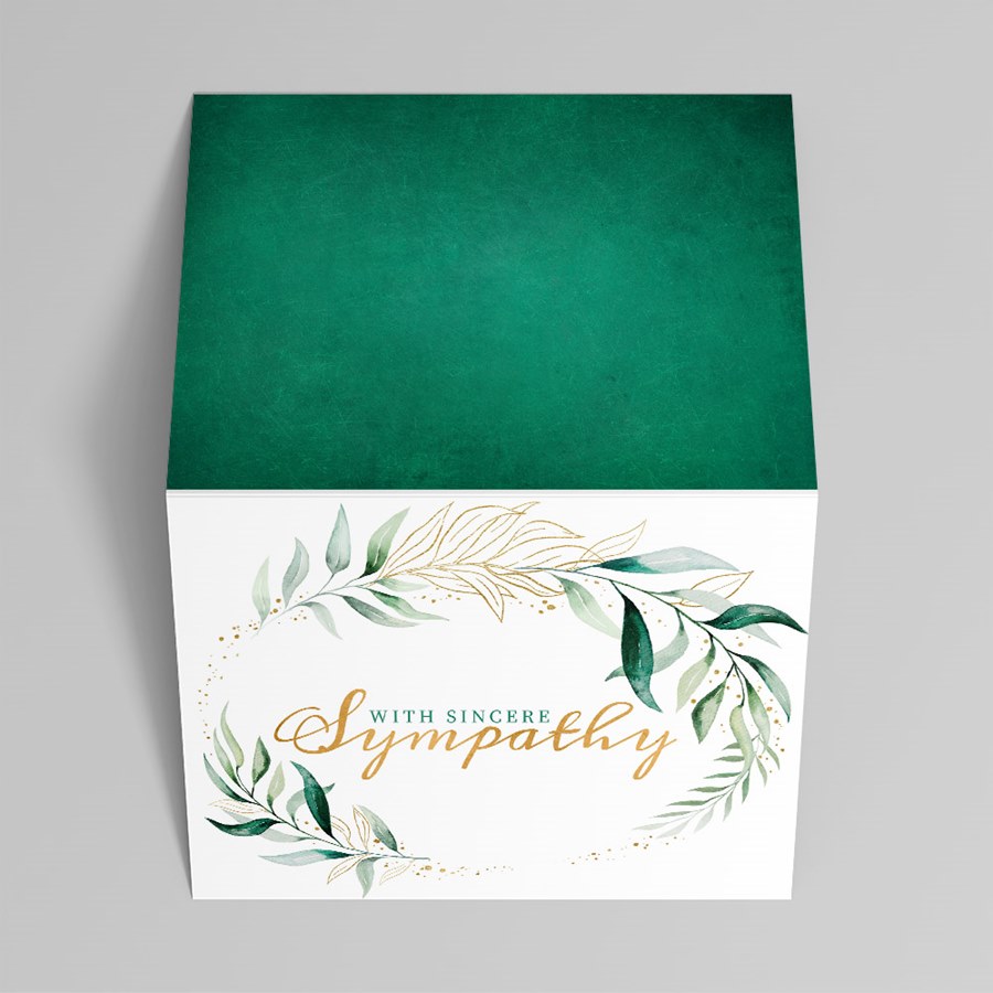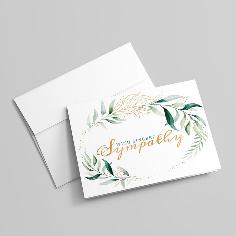 A circular arrangement of watercolor-style green leaves and delicate gold accents frames the centered message, “With Sincere Sympathy,” set against a clean white background for a calm and respectful presentation. Mixed green and gold lettering, paired with a flowing script for the word “Sympathy,” adds warmth and clarity while maintaining a timeless, dignified tone.
