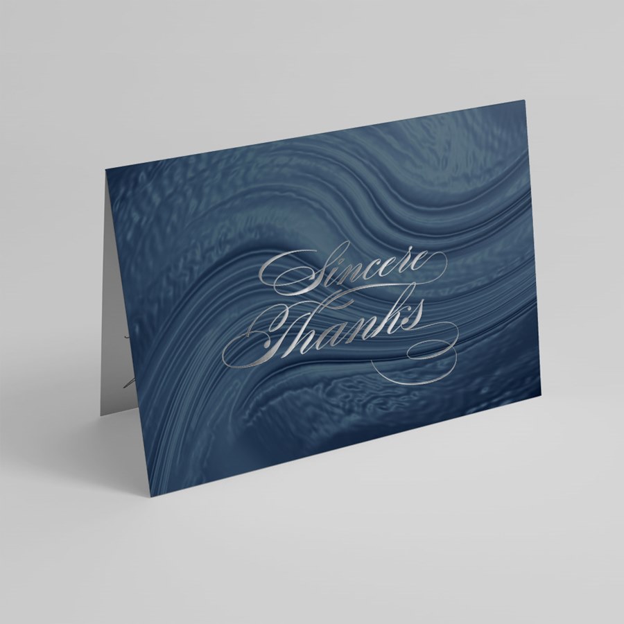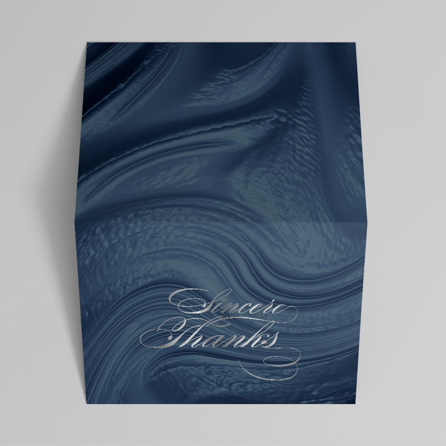 This folded, professionally printed thank you card pairs a flowing navy-blue design with elegant silver script to deliver a message of sincere appreciation with polished style. The eye-catching front features a smooth, swirling blue background accented by the words “Sincere Thanks” printed in a silver foil. The classic folded format provides ample space inside for a personal handwritten note or a printed message, making it easy to customize for any occasion. Shown with a coordinating white envelope, this card is ideal for customer appreciation or a business thank you.