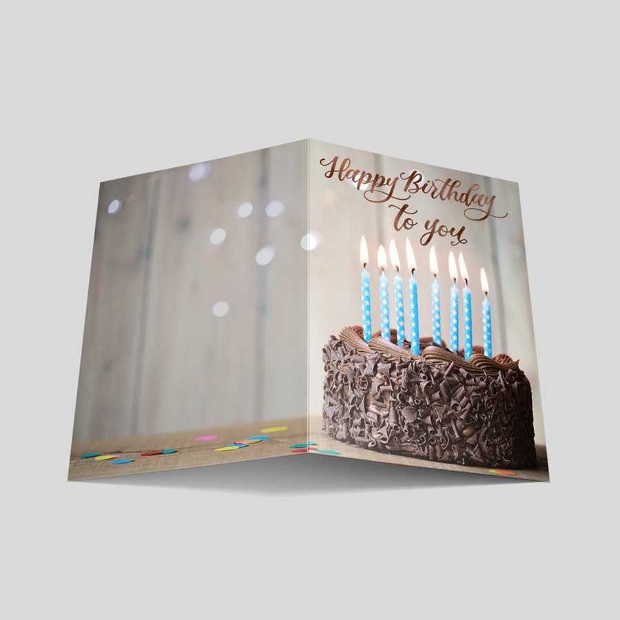 This folded photo birthday card combines a rich, celebratory image with space for a personal message. The striking cover features a chocolate birthday cake with textured frosting, decorative curls, and lit blue candles topped with white stars, while colorful confetti scattered across a warm wood surface creates an inviting, party-ready scene. “Happy Birthday to You” is elegantly printed above the cake in a decorative font for instant impact.