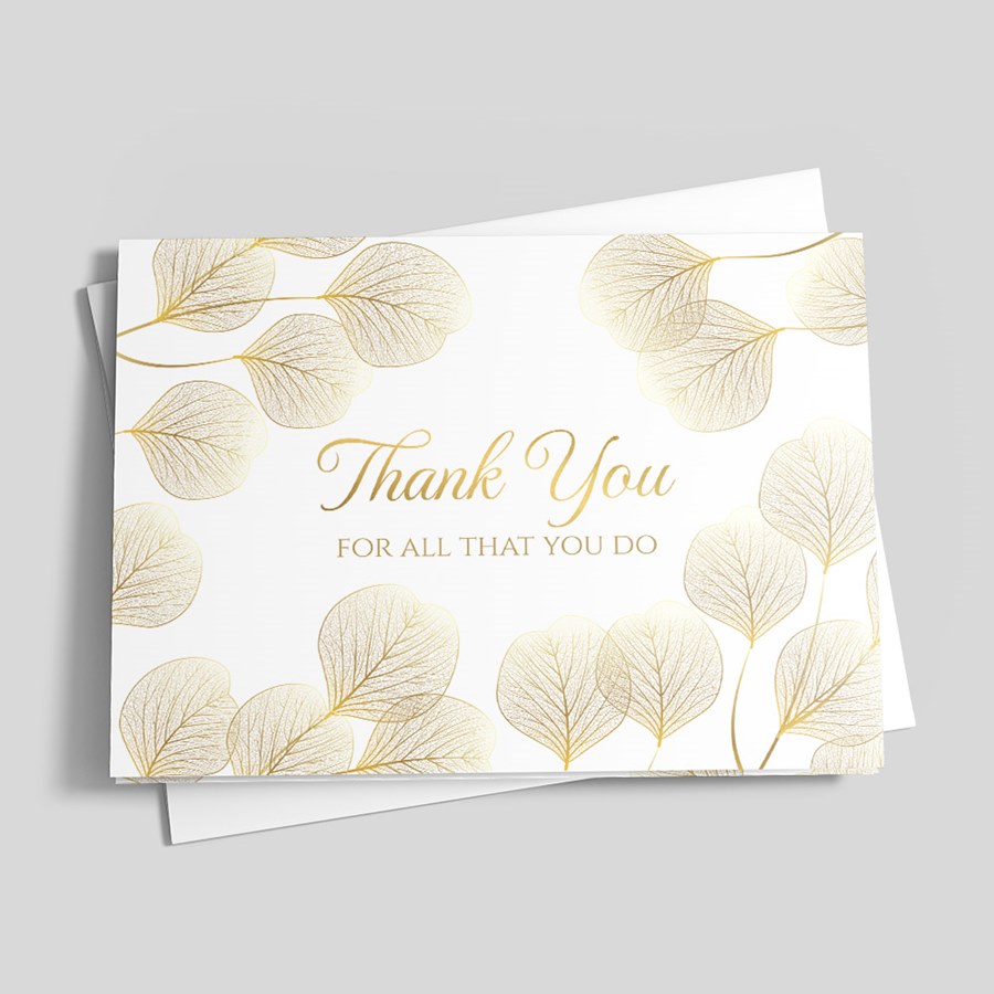 The Soft Golden Leaves Thank You Card features a clean white background accented with delicate gold-tinged leaf motifs that frame the front with subtle elegance. “Thank You” appears in refined script at the center, with “For All That You Do” set below in smaller, warm brown type for a timeless, polished look. The understated design keeps focus on your message while the gold leaf details add an elevated, heartfelt touch.