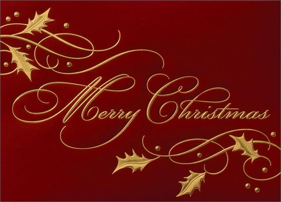 This simple, classic Christmas card is both elegant and festive. The words "Merry Christmas," as well as the decorative holly leaves and berries are printed in gold foil ink which looks impressive against the burgundy background. You can select the verse you want printed inside and add up to four lines of custom imprint below it.
